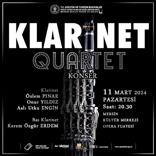 Mersin Devlet Opera ve Balesi 11 Mart 2024 Pazartesi günü saat 20:30’da Opera Fuayesi’nde “Klarinet Quartet” Konseri gerçekleştirecek. Gecenin sanatçıları Özlem Pınar, Onur Yıldız, Aslı Utku Engin, Kerem Özgür Erdem klarinetleri ile tanınmış ezgilere de yer verecekleri konser programında Quartet için önemli eserleri seslendirecekler.