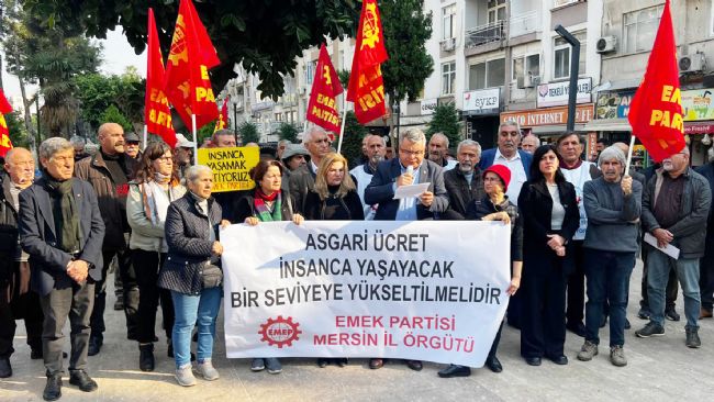 Emek Partisi Mersin il örgütü 2026 yılı açıklanan asgari ücret sonrası “Sermaye istedi, saray rejimi belirledi, asgari ücret açlık sınırının altında kaldı” sloganları ile yaptığı basın açıklamasında iktidara tepki gösterdi. EMEP adına açıklamayı okuyan İl Başkanı Sedat Başkavak “ Çalışma ve Sosyal Güvenlik Bakanı Vedat Işıkhan, 1 Ocak 2026’dan itibaren geçerli olacak asgari ücreti %27 artışla 28 bin 75 lira olarak açıkladı. Açlık sınırının 30 bin liraya, yoksulluk sınırının 100 bin liraya dayandığı koşullarda açıklanan asgari ücret milyonlarca işçi ve ailesini açlık sınırının altında sefalete mahkum etmek demektir.” diye konuştu.