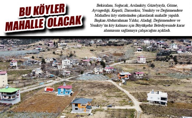 Ancak; Bekiralanı, Soğucak, Arslanköy, Güzelyayla, Gözne, Ayvagediği, Kepirli, Darısekisi, Yeniköy ve Değirmendere Mahallesi köy statüsünden çıkarılarak, mahalleye dönüştürülmek üzere Büyükşehir Belediye meclisine gönderildi.