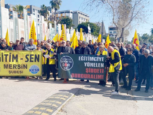 İstanbul Çeşmeköy’de bir öğrencinin 2 öğretmeni bıçaklaması Türkiye gündemine oturdu. Saldırı sonucunda bir öğretmen hayatını kaybederken, tüm Türkiye’de eğitimciler 1 günlük iş bıraktı. Mersin’de de İl Milli Eğitim Müdürlüğü önünde bir araya gelen eğitimciler, okullarda şiddetin son bulmasını istedi. Grup adına konuşan Eğitim Sen Mersin Şube Başkanı Mahmut Sümbül, İstanbul’da gerçekleştirilen bıçaklı saldırıda iki öğretmenin ve bir öğrencinin yaralandığını, yaralanan öğretmenlerden birinin tüm müdahalelere rağmen yaşamını yitirdiğini belirterek, “Bugün burada yalnızca aramızdan koparılan arkadaşımız için değil, yıllardır göz ardı edilen itibarımız ve can güvenliğimiz için toplandık. Yaşamını kaybeden meslektaşımızın ailesine, yakınlarına, öğrencilerine ve tüm eğitim emekçilerine başsağlığı diliyoruz. Yaralanan öğretmen arkadaşımıza ve öğrencimize acil şifalar diliyoruz. Ancak açıkça ifade ediyoruz: Bu saldırı münferit değildir. Okullarda artan şiddet vakaları uzun süredir ciddi bir tehdit oluşturmaktadır. Yaptığımız uyarıları dikkate almayarak, kalıcı ve önleyici politikalar hayata geçirmeyen Milli Eğitim Bakanlığı bu olayın birinci derecede sorumlusudur. Somut ve kalıcı adımlar atılmadığı için şiddet ortamı giderek derinleşmiştir. Bir okulda kesici aletle saldırı gerçekleştirilebilmesi, güvenlik mekanizmalarının yetersizliğini açıkça ortaya koymaktadır. Okullarda şiddeti önleyici destek mekanizmaları ciddi biçimde gözden geçirilmelidir” dedi.