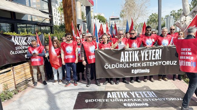 İl Milli Eğitim Müdürlüğü önünde ‘Artık yeter’ pankartıyla bir araya gelen Eğitim İş Sendikası Mersin Şubesi üyeleri, okullarda şiddetin son bulmasını istedi. Eğitimciler adına konuşan Eğitim İş Sendikası Mersin Şubesi üyesi Serkan Toptutan, Türkiye’de okulda yine bir öğretmenin öldürüldüğünü belirterek, “Bu tablo bir münferit olay değildir! Bu tablo, yıllardır görmezden gelinen uyarıların, itibarsızlaştırılan öğretmenlerin, güvenliksiz bırakılan okulların sonucudur. Öğrenciyle ilgili rehberlik görüşmeleri yapılmış, tutanaklar tutulmuş, uyarılar yapılmış, hatta çocuk psikiyatrisi tedavi süreci olduğu bilinmektedir. Buna rağmen gerekli önlemler alınmamıştır. Bu açık bir ihmal zinciridir. Bu sorumluluk öğretmenin, okul idaresinin üzerine yıkılamaz” dedi.