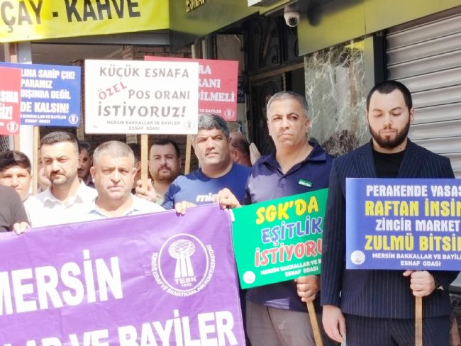 Mersin Bakkallar ve Bayiler Esnaf Odası üyeleri, zincir marketlere karşı sokağa indi! Bakkalcılar Odası Başkanı Ramazan Turan, “Perakende Yasası raftan insin, z...