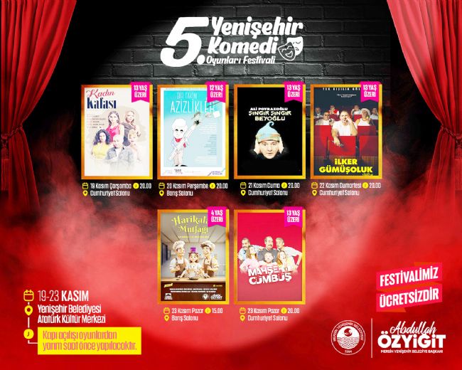 Mersin Yenişehir Belediyesi, bu yıl düzenlediği kültür ve sanat etkinliklerine bir yenisini daha ekleyerek 5.Yenişehir Komedi Oyunları Festivali’ni tiyatrosever...