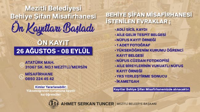 Behiye Şifan Misafirhanesi ön kayıtları başladı