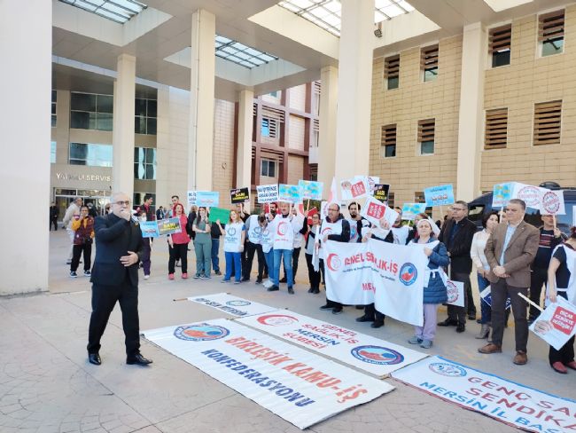 Genel Sağlık İş Mersin Şubesi üyeleri, memur maaş zamlarını, sağlıkta şiddeti ve sağlık politikalarını hastane önünde düzenlediği eylem ile protesto ederek, ikt...