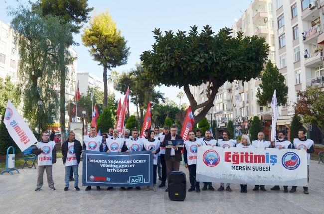 Sözde yetkili sarı sendikaların memnuniyet ve pişkinlikle karşıladığı vergi adaletsizliğine isyan eden Eğitim İş Mersin Şubesi üyeleri, “Bu soygunu kabul etmiyo...